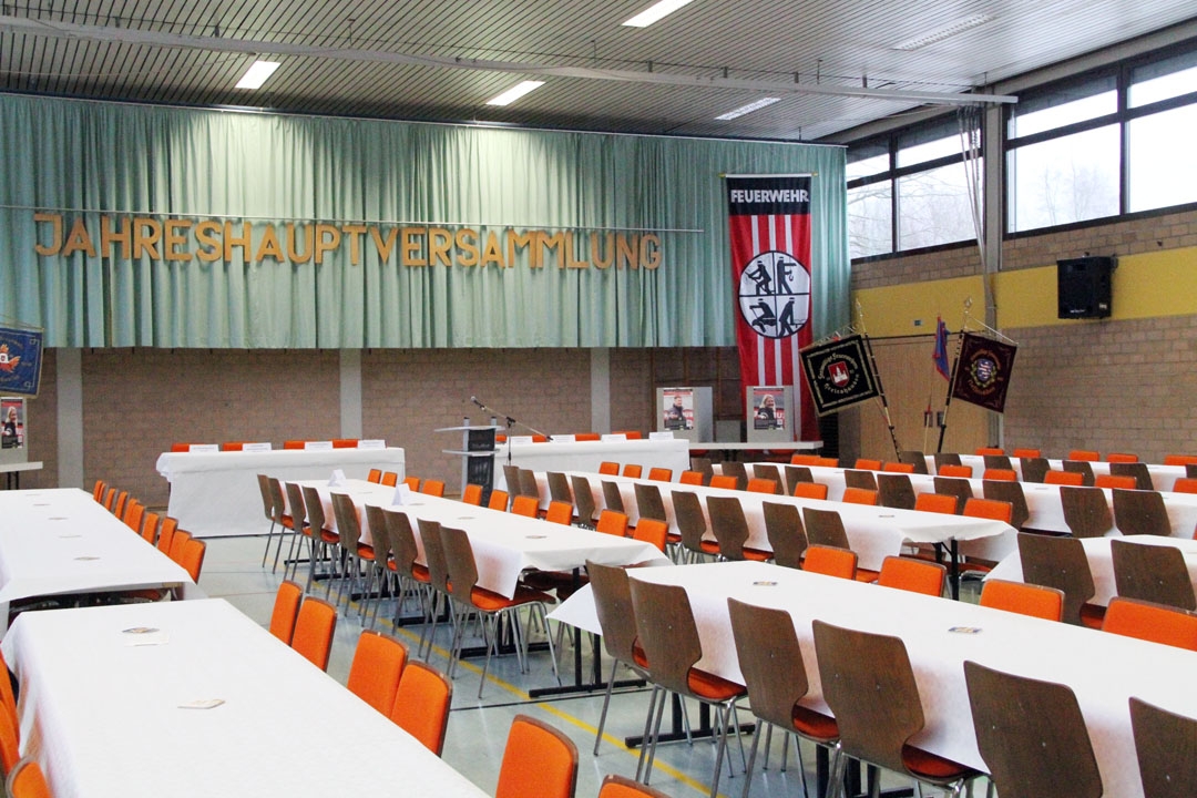 … dürfte es in der Herleshäuser Mehrzweckhalle ganz ähnlich aussehen, vielleicht eine Spur feierlicher. Auch dann werden viele Stühle stehen, so viele wie möglich und noch deutlich mehr als heute. Was passiert denn dann? Genau heute in einem Jahr findet der offizielle Abend des Jubiläumsjahres statt. Beim Festkommers könnte der gemeindeeigene Hallenbau an seine Kapazitätsgrenzen stoßen. Lassen wir uns überraschen, was nach langer Planung an jenem Abend dann los sein wird. Am heutigen 16. März des Jahres 2018 sind jene Fotos hier entstanden, als die MZH schon für die Jahreshauptversammlung aller Feuerwehren der Großgemeinde vorbereitet war.