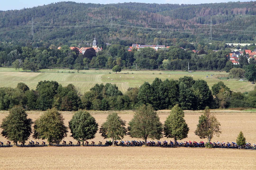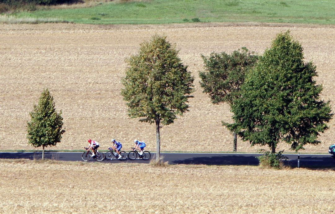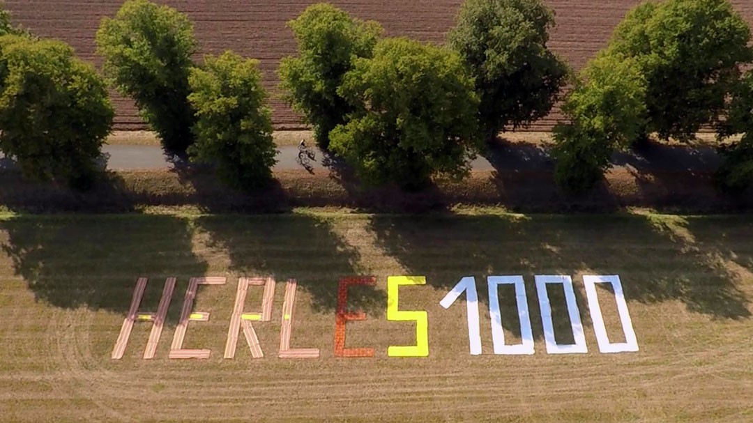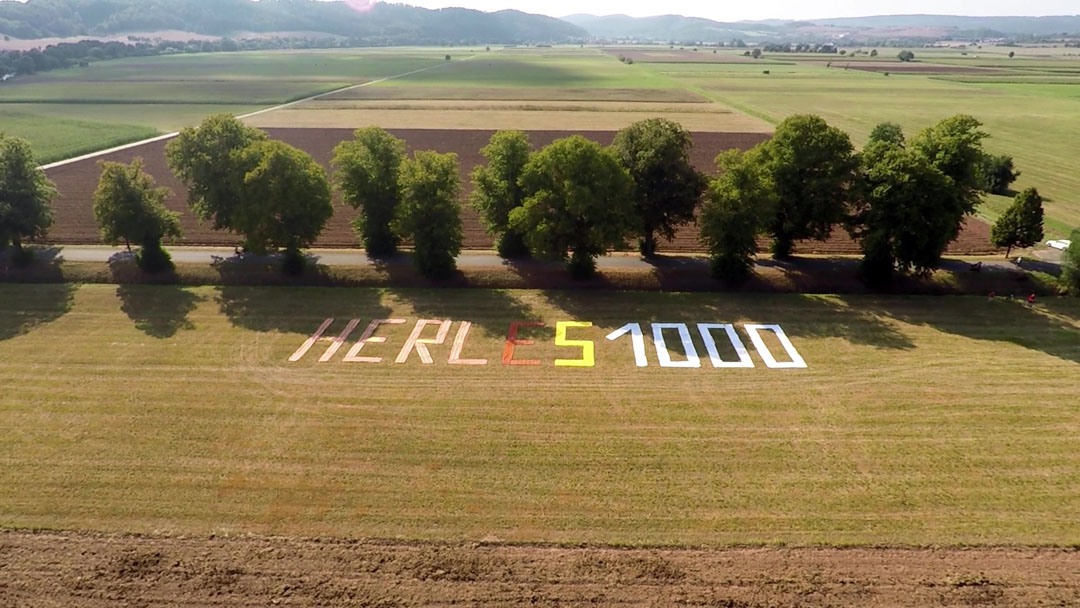 Wir hatten uns das so schön vorgestellt: Das Radlerfeld der Deutschland-Tour rollt an der Werra entlang und der Helikopter fängt den bunten Wurm aus der Luft ein. Zwischen Brandenburg und den Werra-Mäandern entstehen besonders spektakuläre Bilder, die den Regisseur frohlocken lassen. Und da drüben bei der langen Lindenallee erscheint schon der nächste Blickfang. Ein Schriftzug ist´s – genauer betrachtet erkennt man HERLES1000. Prima, da hat der gute Florian Naß ja was zu erzählen. Der hr-Reporter, der in Frankreich mittlerweile mit jedem Chateau per Du ist, weiß auch prompt des Rätsels Lösung: „Ja und hier, liebe Radsportfreunde, blicken wir nach Hessen auf die andere Werraseite. Von dort aus grüßt HERLES1000 die Radfahrer und macht uns darauf aufmerksam, dass man im ehemaligen Grenzübergangsdorf Herleshausen, einst bekannt im ganzen Land, in diesem Jahr das 1000-jährige Jubiläum feiert.“
