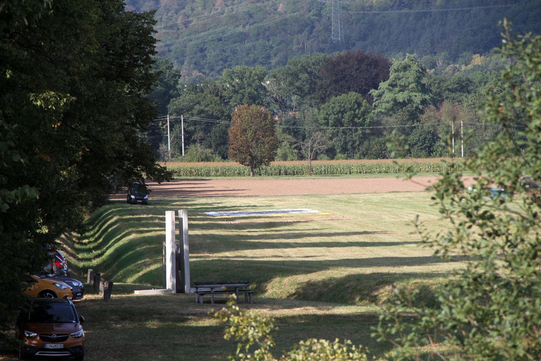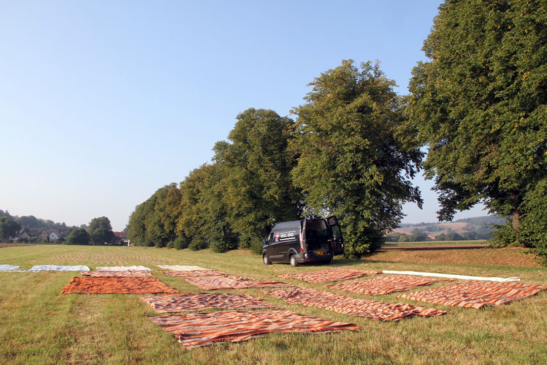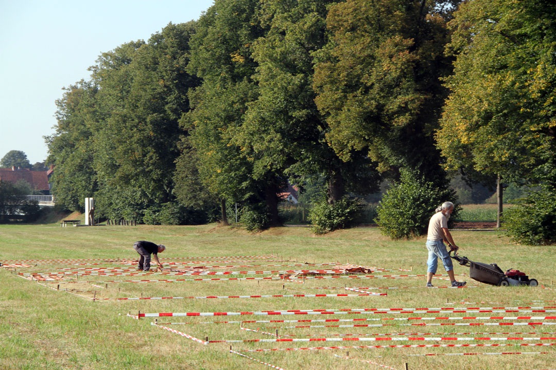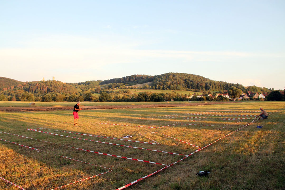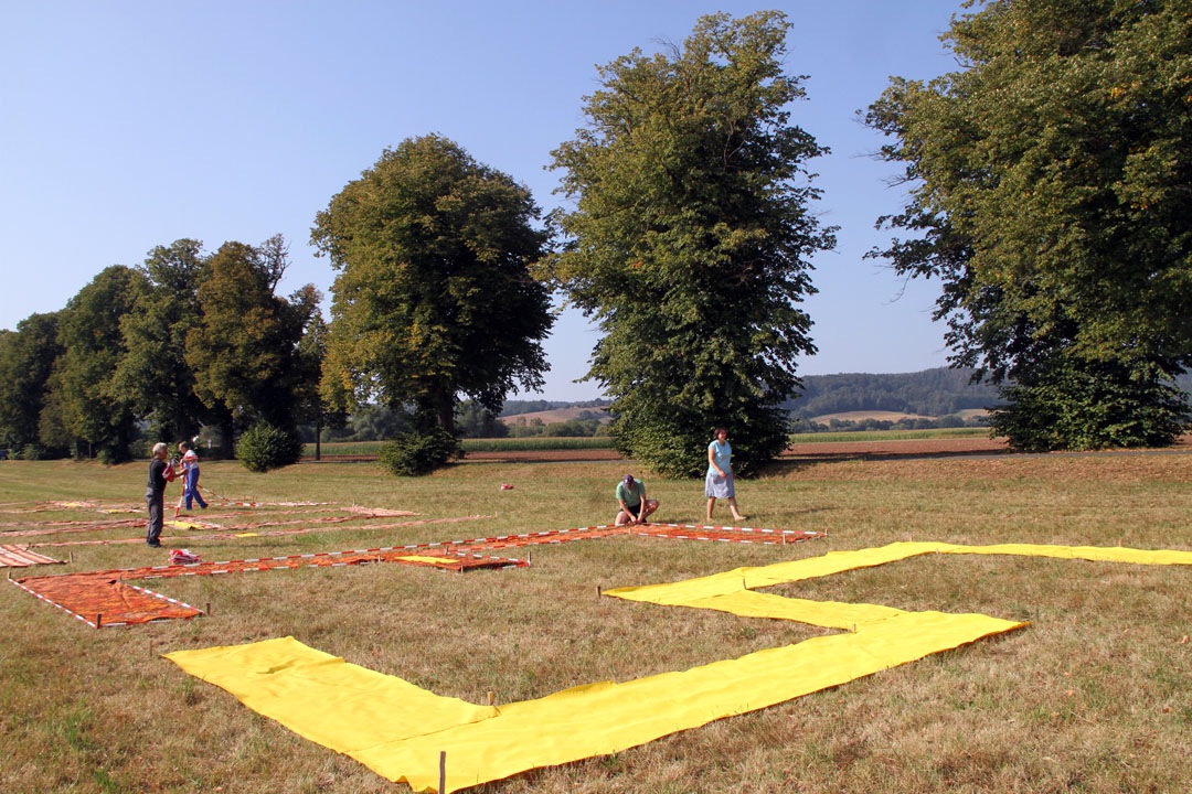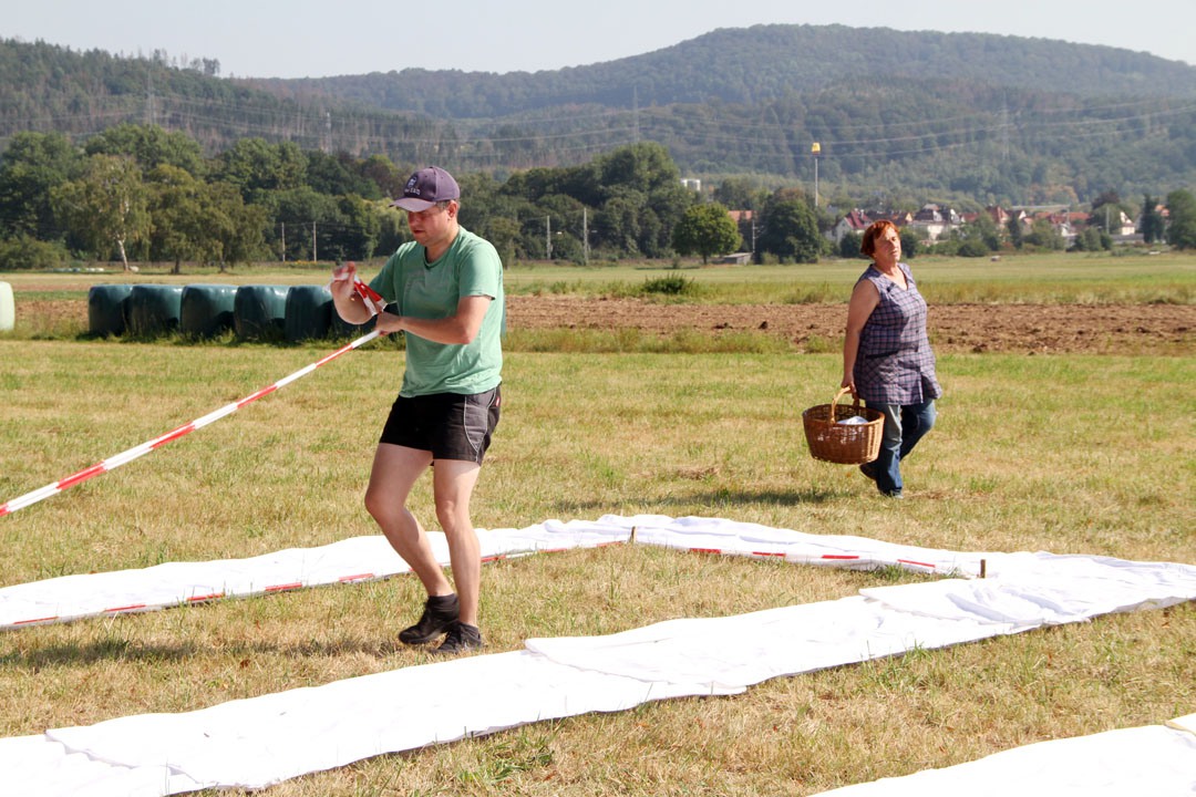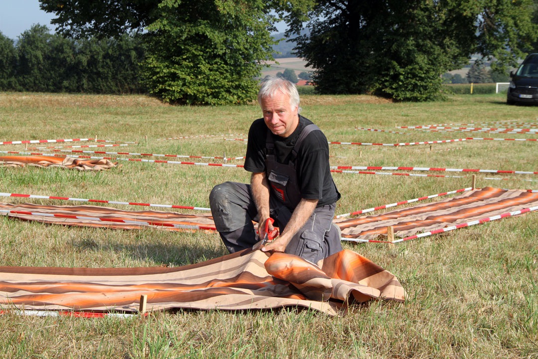 So oder ähnlich hätte es der hr-Plauderer möglicherweise formuliert und unser Dörfchen erneut bekannt gemacht. Dafür haben ein paar ganz Unerschrockene von uns einige Stunden Arbeit und Vergnügen investiert. Sechs Buchstaben und vier Zahlen wurden mit Trassierband, aufgespannt an kleinen Hölzern, vorgezeichnet, um am Samstagvormittag gefüllt zu werden. Bei einer Länge von 75 Metern und einer Buchstabenhöhe von 10 Metern war ganz schon viel Stoff nötig. Gut, dass unser Raumausstatter Roland Müller noch Markisenreste zu hauf rumliegen hatte und so spontan zum Wiesenausstatter mutierte. Geschmackvolle Buchstaben im Retro-Stil und grelle Zahlen in reinstem Weiß. Ein Dankeschön an alle Bettlaken-Spender, die kurzfristig daheim nach alten Laken gekramt haben.