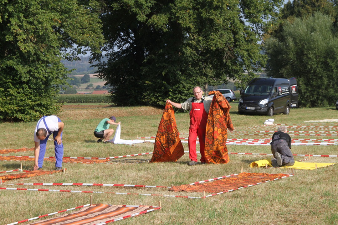 War es am Vormittag noch windstill, so ärgerten uns später einige Böen, in dem sie die Tücher aus der Form brachten. Glücklicherweise bemerkte Klaus das Malheur und korrigierte alles wieder. Zusammen mit Manfred und Uwe – die Jungs für alle Fälle –  befestigte er die Laken und rettete die Schrift. Es war angerichtet …