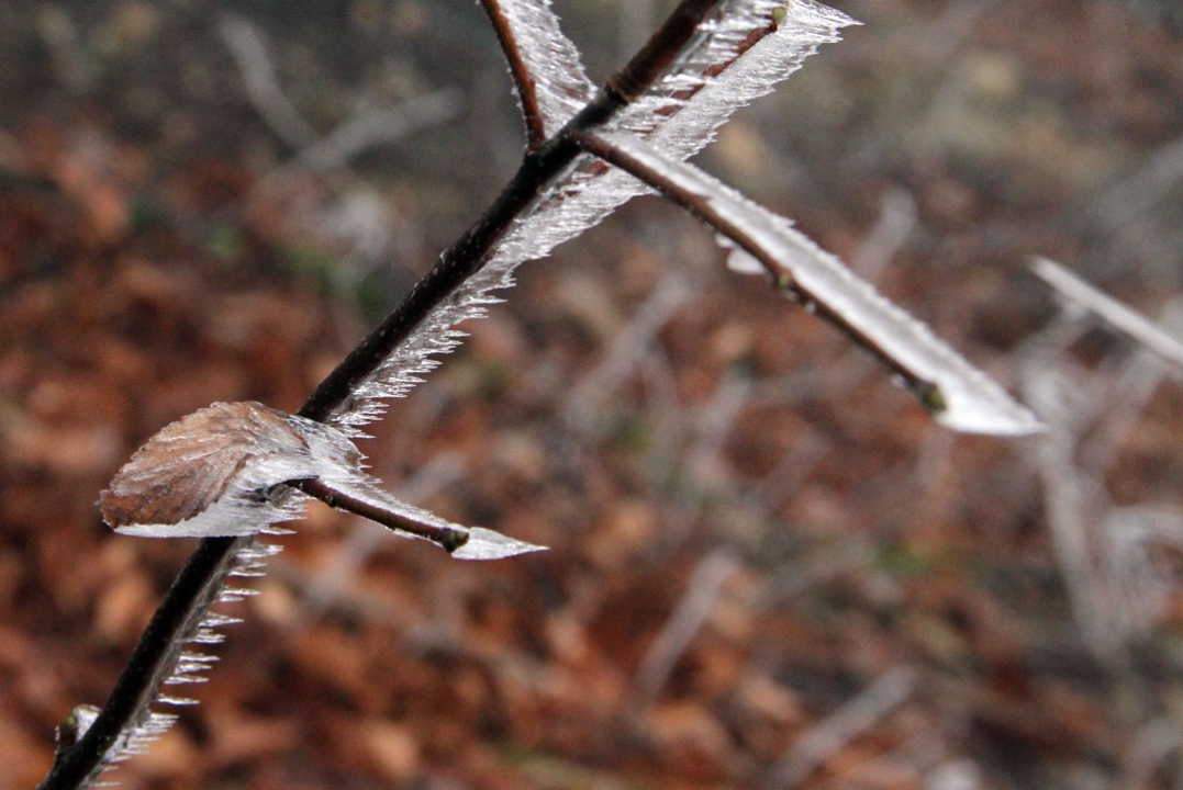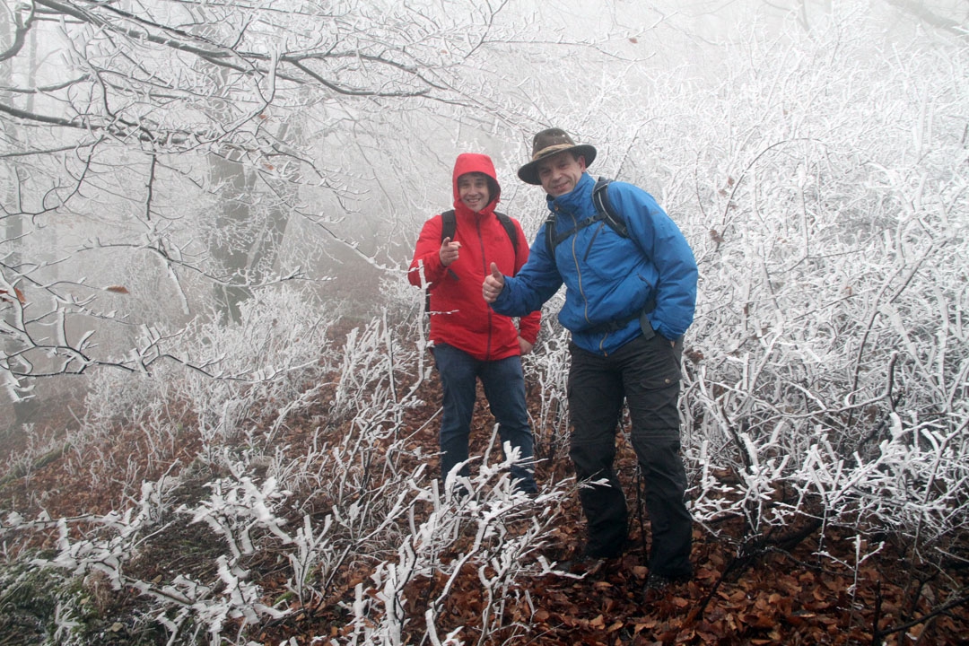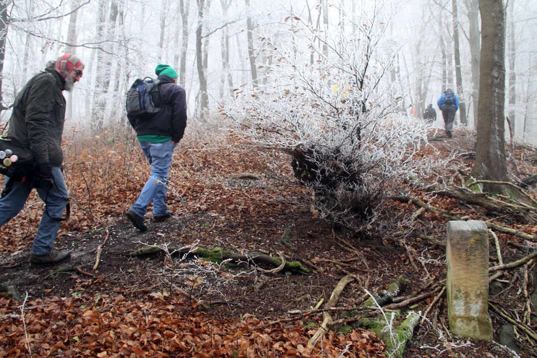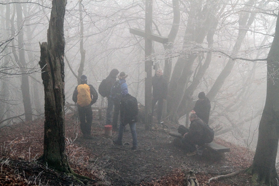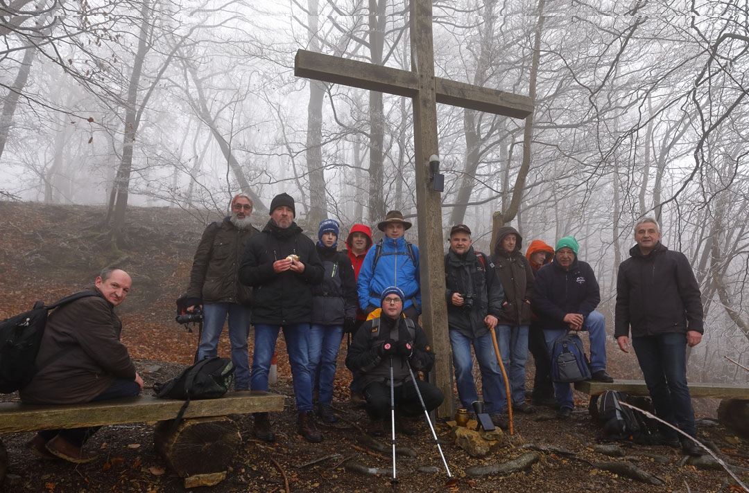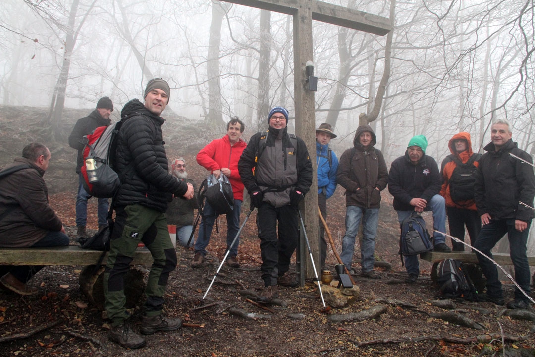 Die Wanderung führte in einem kleinen Bogen, teils querwaldein, hinauf zum Kielforst und dem Kreuz auf dem Franzosenkopf, wo uns überraschend ein winterlicher Weißtupfer daran erinnerte, dass wir ja Dezember haben.